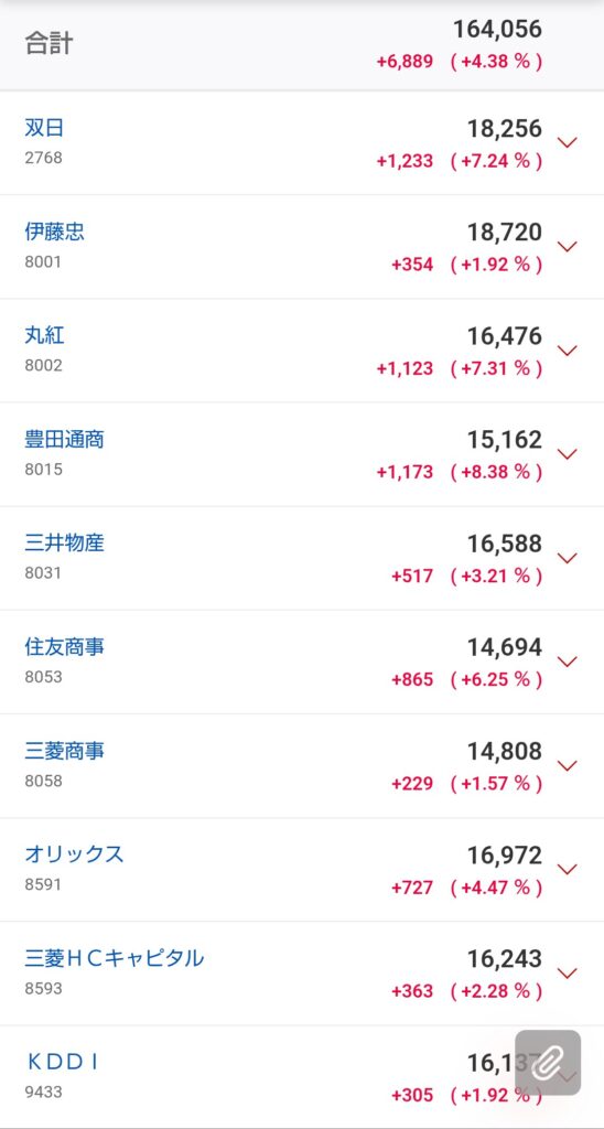 双日、三菱商事などの商社株をメインに10社均等投資を実施しました