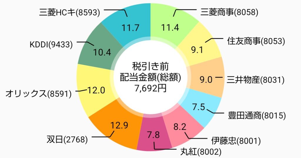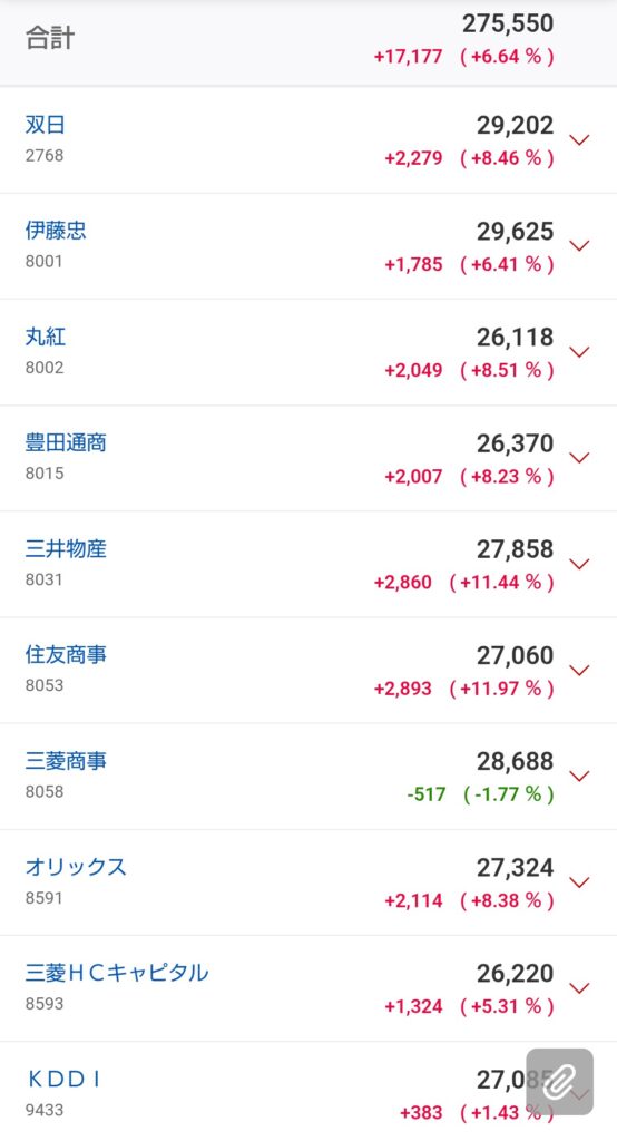 12月も銘柄変更はせずに商社株を中心に10社均等投資を実施しました
